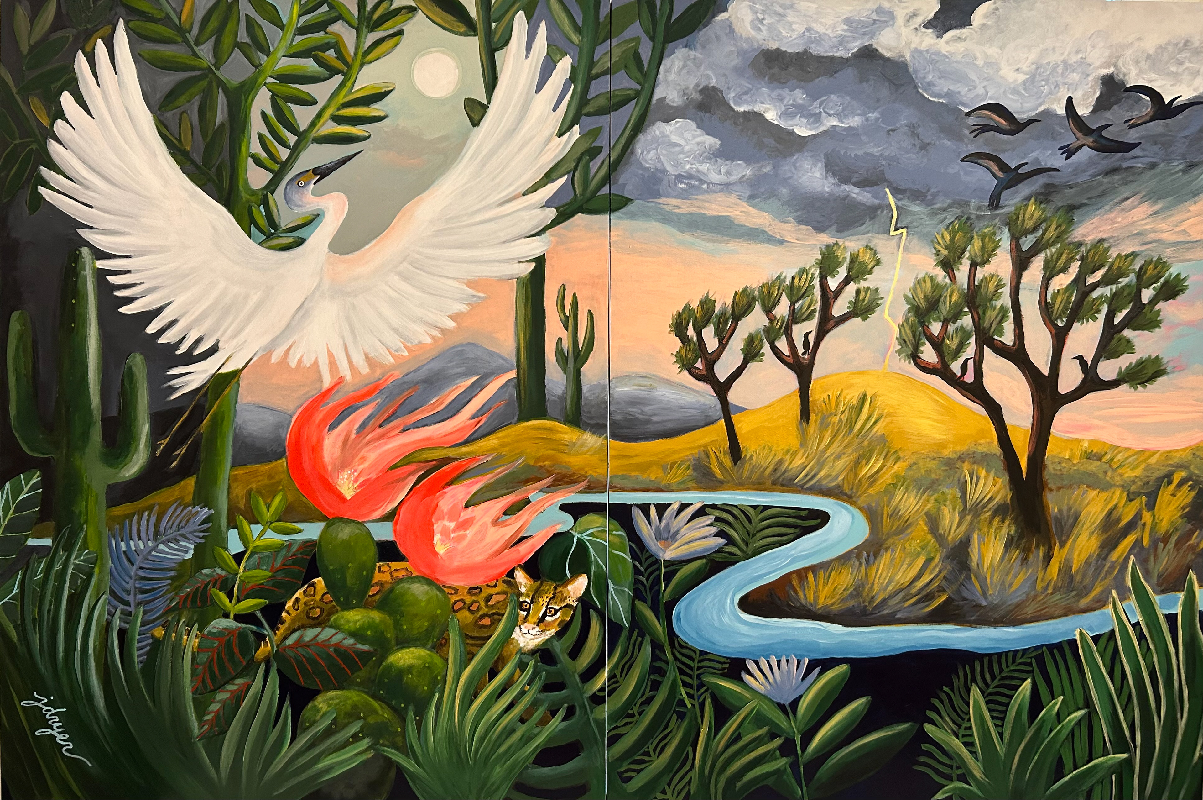 THE OCELOT DREAM, 6’ x 4’; acrylic on two birchwood panels. Pricing available upon request.